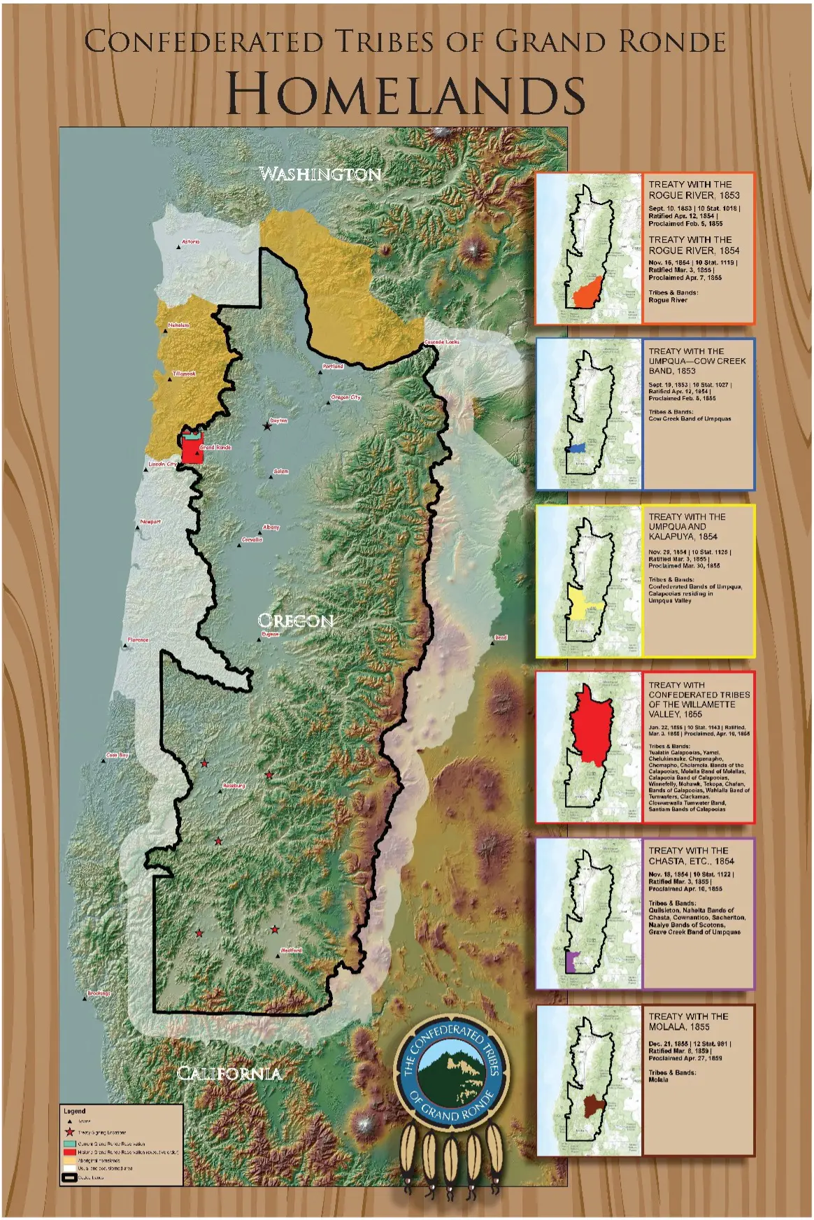 The Tribal Homelands of the Confederated Tribes of Grand Ronde include the historic Grand Ronde Reservation, ceded lands, aboriginal homelands, and usual and accustomed areas of the Tribe. The antecedent tribes and bands that make up the modern-day Tribe have ancestral homelands ranging from southwest Washington, through most of western Oregon, to northern California.